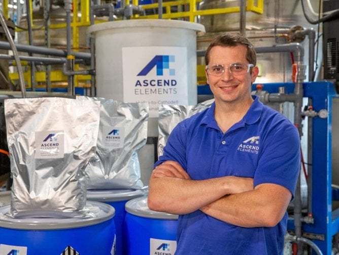 Ascend Elements opera en cuatro sitios en los Estados Unidos y un sitio en Polonia, con una tasa de recuperación de hasta el 98% en minerales críticos de baterías de iones de litio usadas.